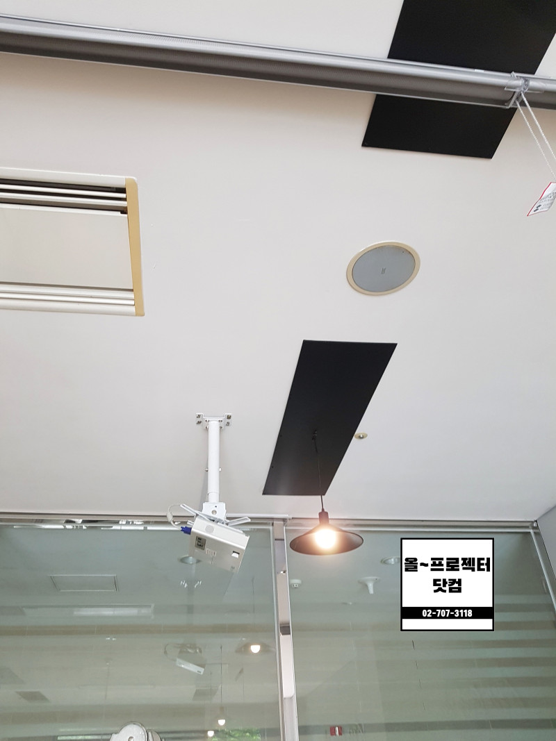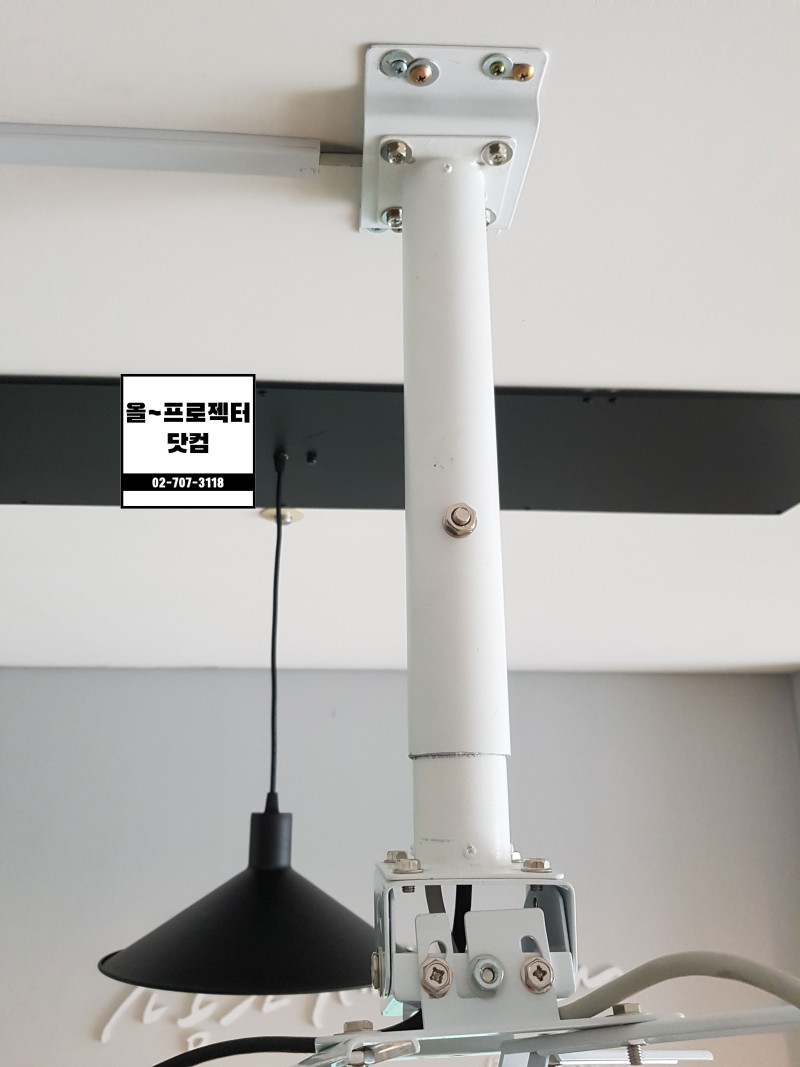 천정이 비교적 높은데 낮게 투사해야 해서 프로젝터 브라켓에 1M 봉을 연결해 확장설치를 했습니다.