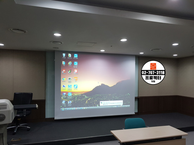기존에 쓰시던 제품도 화면은 꽉 채워 쓰지 못했었는데, 화면을 꽉 채우면 아랫단의 텍스트가 보이지 않는 점이 고려가 되어 약간 사이즈를 줄여 투사 테스트가 진행되었고 깔끔하게 완료되었습니다! 이상 CP-X5022WN 설치기 였습니다.